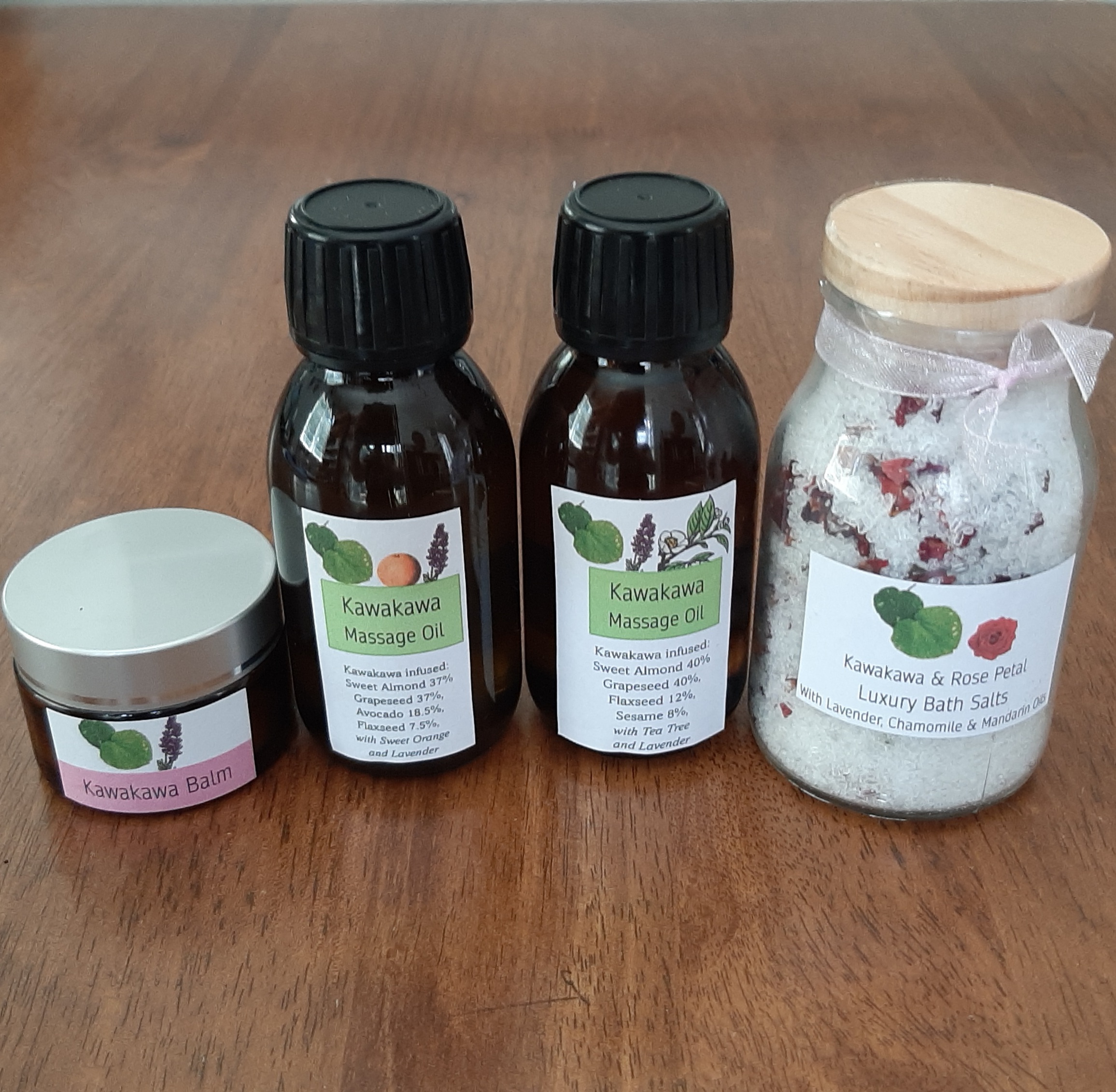 Kawakawa Massage Oil duo with Balm and Luxury Bathsalts  $70 plus free gift of Handwash Soap and Dish (worth $15 optional)